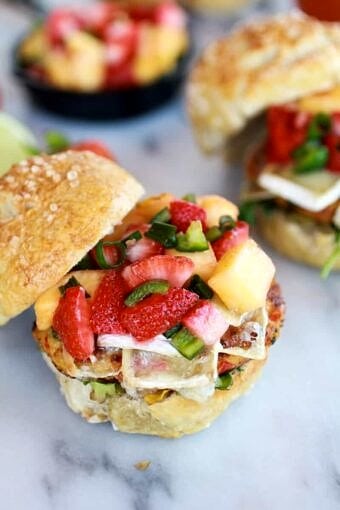 Save RecipeMain CourseMay 30, 2013Brie Crab Cake Pretzel Slider Melts with Strawberry Pineapple Salsa