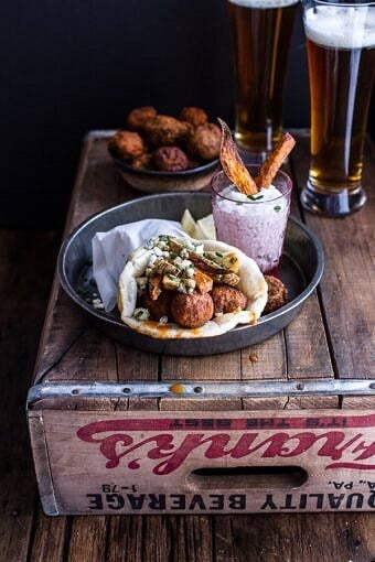Save RecipeMain CourseSeptember 8, 2014Buffalo Falafel Pitas w/Garlic Blue Cheese Fries + Ranch Style Tzatziki.