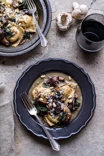 Save RecipeMain CourseSeptember 10, 2014Taleggio Ravioli with Garlicy Butter Kale and Mushroom Sauce + Toasted Pine Nuts.
