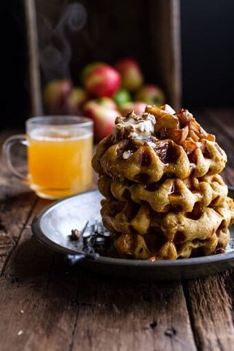 Save RecipeVegetarianOctober 3, 2014Overnight Cider Pumpkin Waffles w/Toasted Pecan Butter, Cider Syrup + Spiced Apples.
