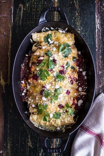 Save RecipeMain CourseOctober 29, 2014Roasted Chicken + Smoked Gouda Enchiladas w/Fire Roasted Tomatillo Cranberry Sauce.