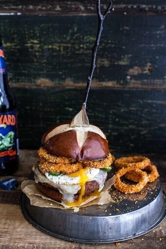 Save RecipeMain CourseOctober 22, 2014Sweet Potato Black Bean Chili Burgers w/Baked Cheddar Beer Onion Rings.