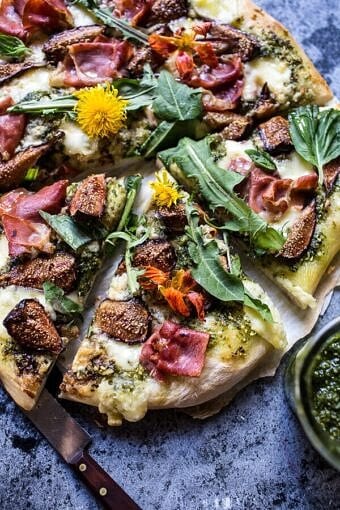 Save RecipeMain CourseJune 15, 2015Dandelion Green Pesto, Fresh Fig and Gorgonzola Pizza with Prosciutto.