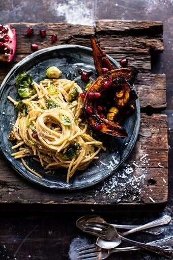 Save RecipeMain CourseNovember 10, 2016Brussels Sprout Carbonara with Pomegranate Roasted Winter Squash.