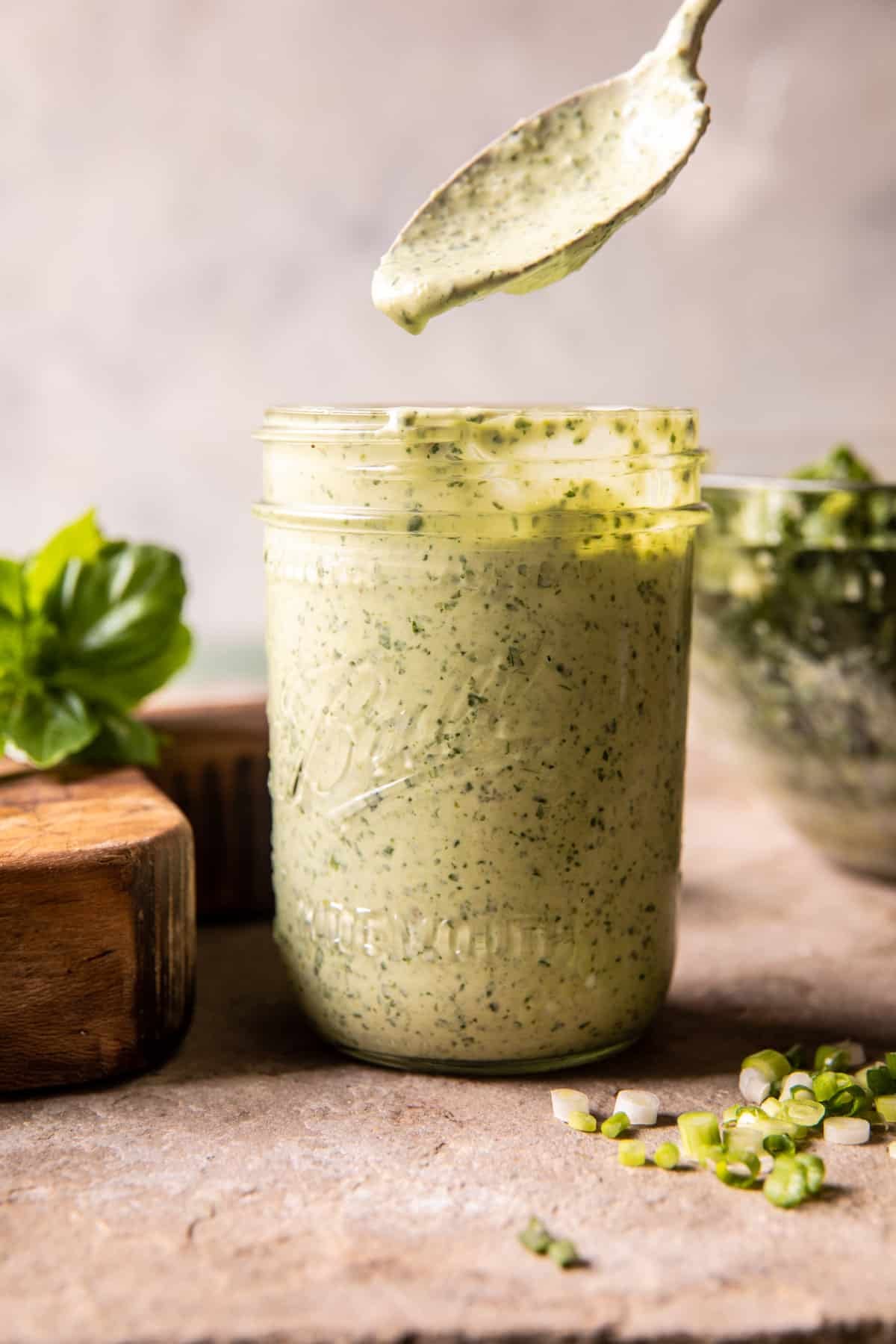 This is a creamy jalapeño ranch with yogurt, mayo, and lots of pickled jalapeños. I blend everything up in a blender until creamy.