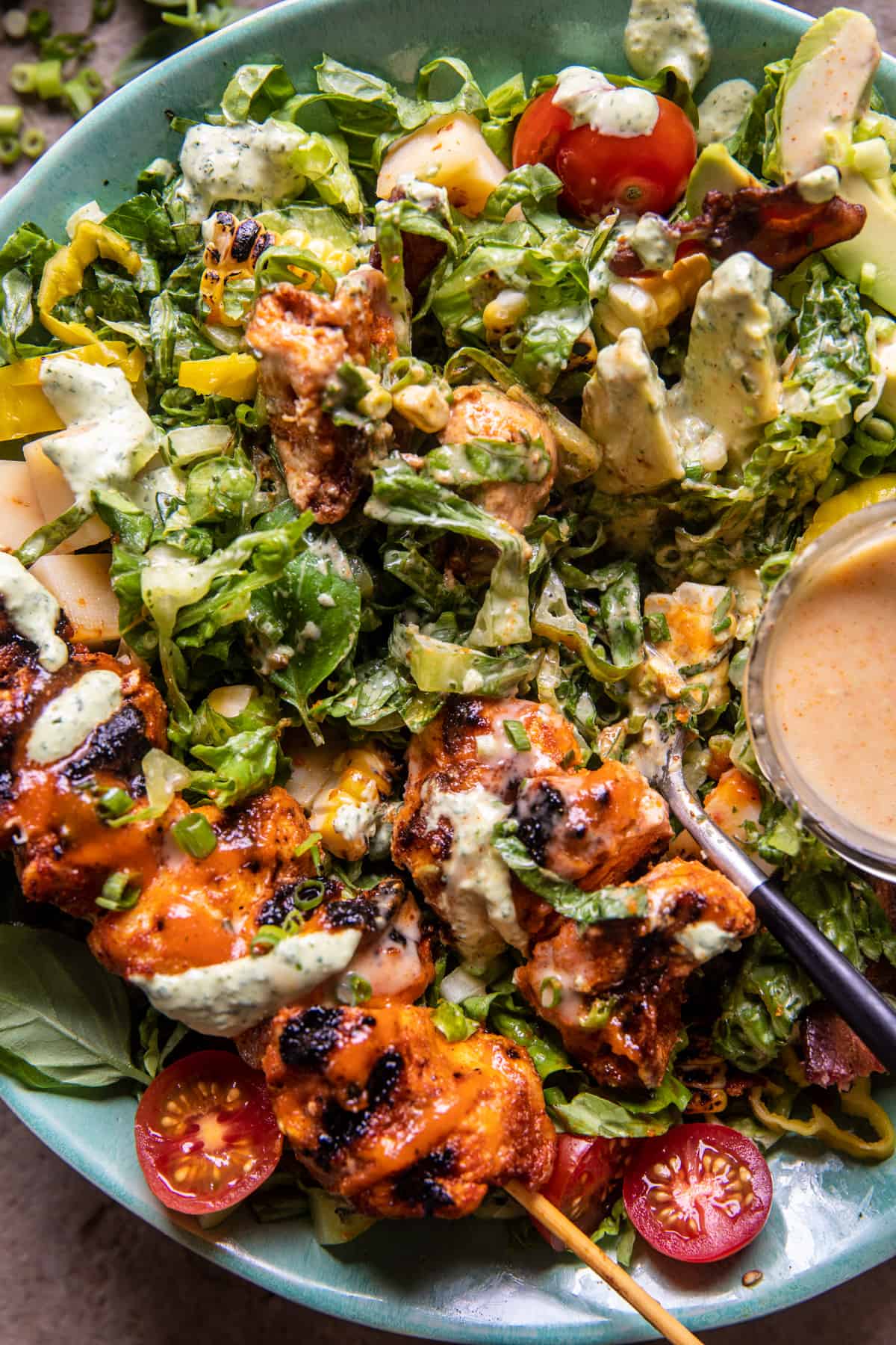 My Chopped Buffalo Chicken Skewer Salad just might become your new summer dinner staple. Spicy, saucy buffalo chicken grilled up on skewers and tossed together with fresh greens, grilled corn, avocado, cheddar cheese cubes, and crispy bacon. Be generous with the creamy jalapeño ranch dressing, it’s extra delicious on top of this spicy-sweet honey buffalo chicken. A perfectly balanced summer dinner salad everyone will love.