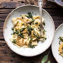 Mondays are made better with this Butternut Squash Cheese Ravioli. Fresh pasta dough (or wonton wrappers) filled with pureed roasted butternut squash, 3 cheeses, and served with a delicious, nutty browned butter sage pesto that’s sure to become your new favorite pesto for all of your cozy autumn and winter dishes.