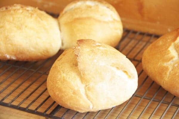 • Meanwhile, prepare the bread bowls: Using a sharp knife, cut a circle into the top of each loaf, leaving a 1-inch border all around. Remove the bread top, then hollow out the middle with a fork or your fingers, leaving a thick bread shell.