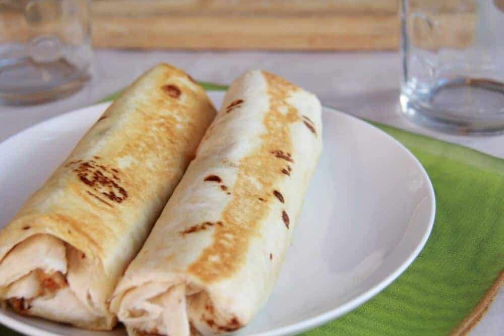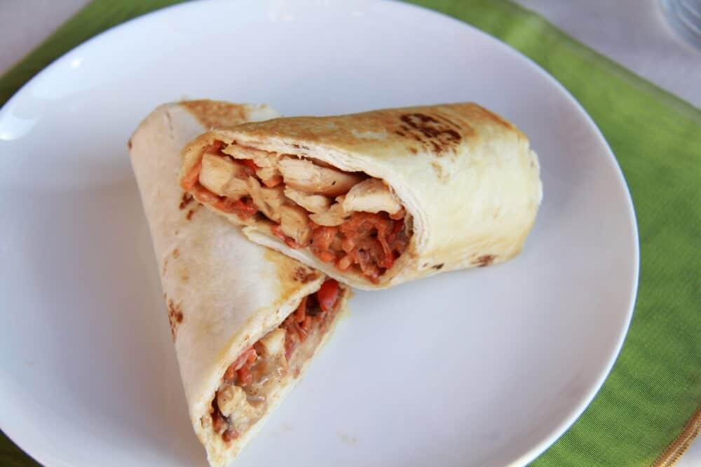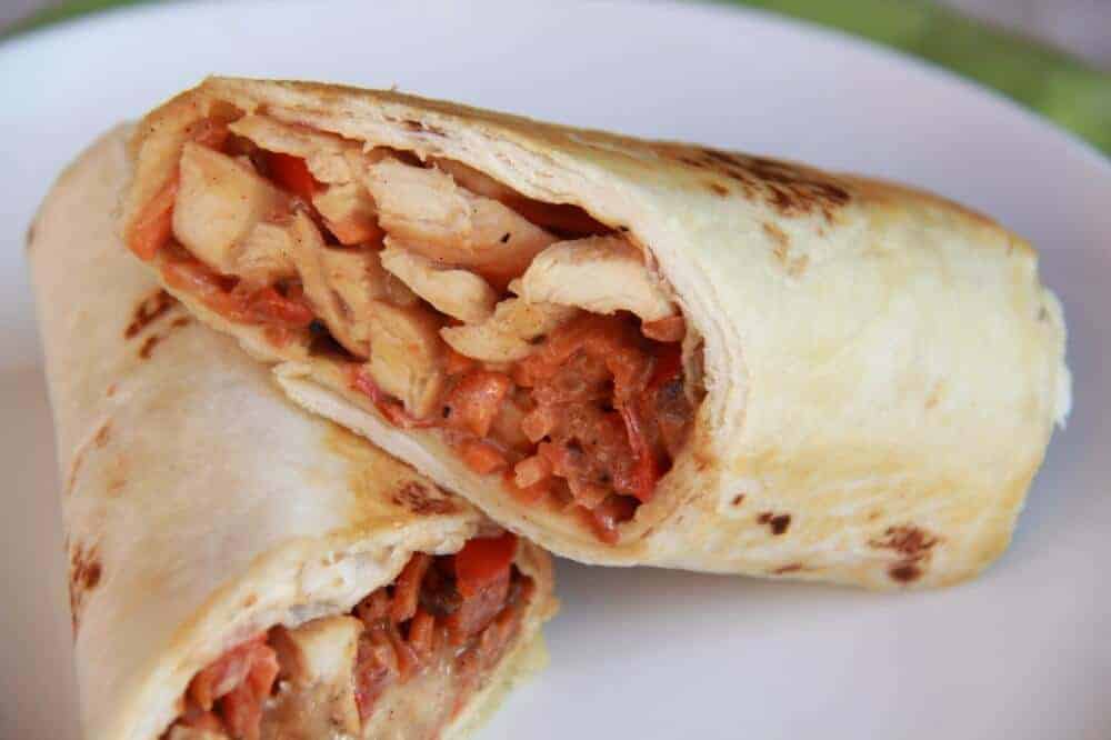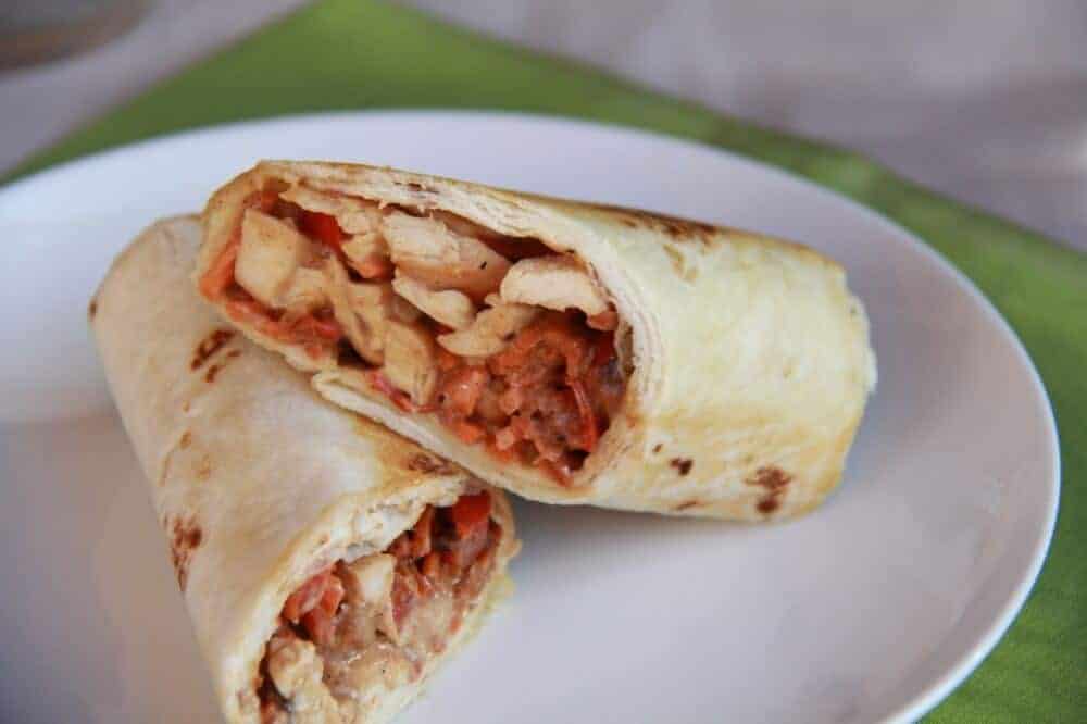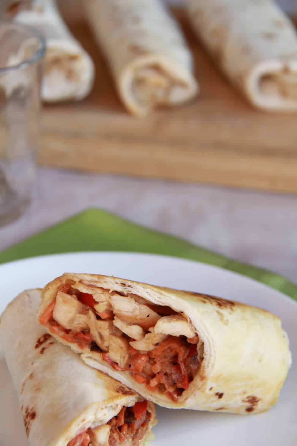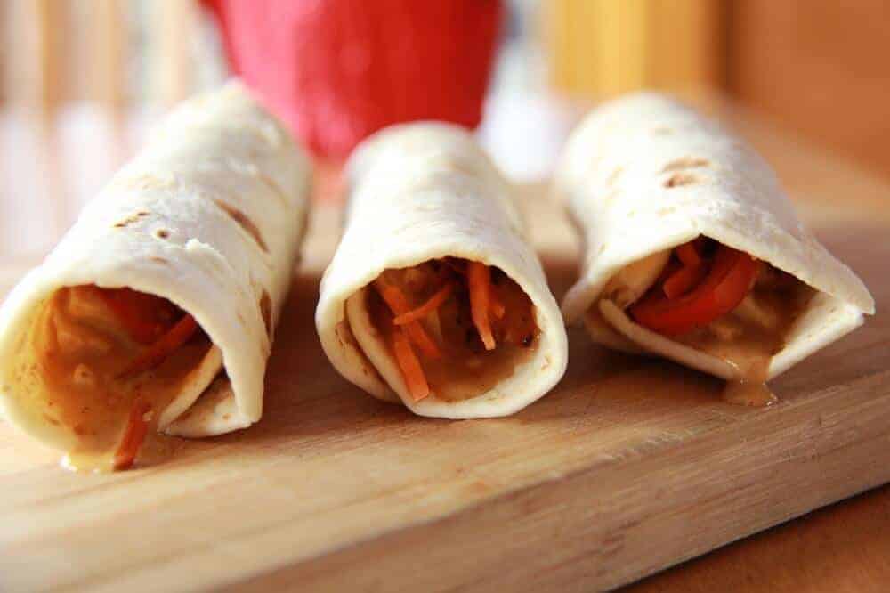 • Working with two tortillas at a time heat them in the microwave for 30 seconds. Add a good amount of the chicken and sauce to the top of one tortilla. Top with some veggies and then tuck in the sides and roll tightly. Repeat with remaining ingredients.