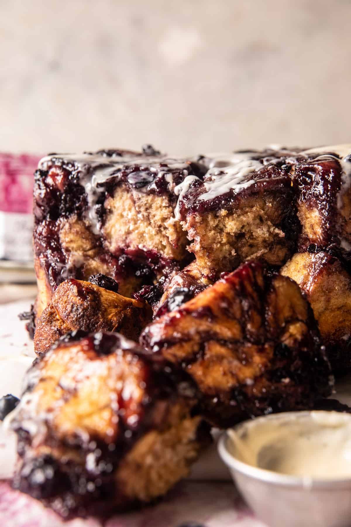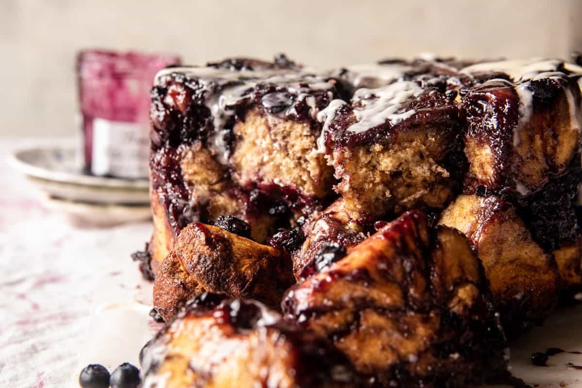 Easy Blueberry Monkey Bread. This is the monkey bread recipe you need for spring and summer days. Soft and fluffy dough balls coated with cinnamon sugar and sweet blueberry jam. Serve while warm, drenched with brown butter icing that melts into every nook and cranny. There’s nothing not to love, every doughy bite is full of sweet blueberry goodness. And the icing is just that, “icing on the cake”. So yummy.