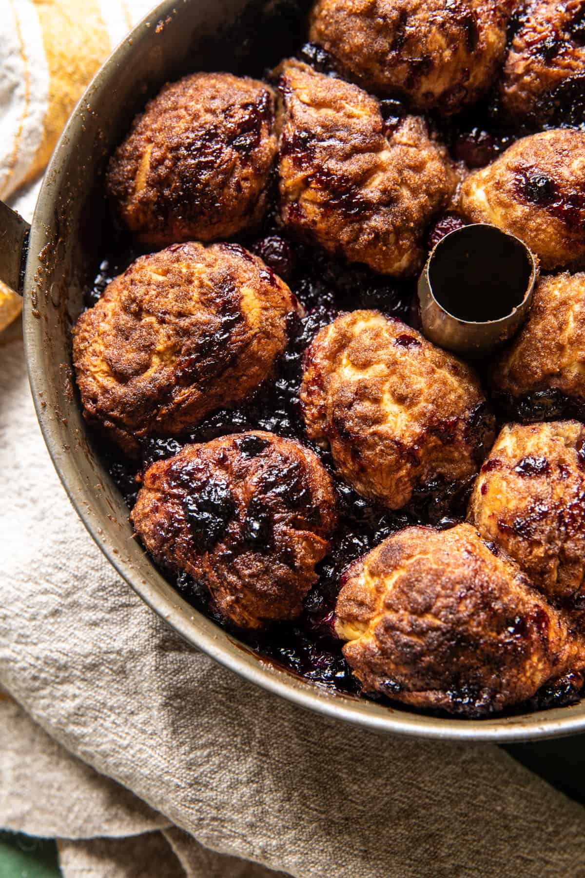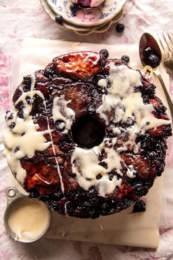 Arrange the balls in a bundt pan and layer them with blueberry jam and fresh blueberries. Nothing too fancy, but once baked up, it’s always impressive, and of course, so delicious.