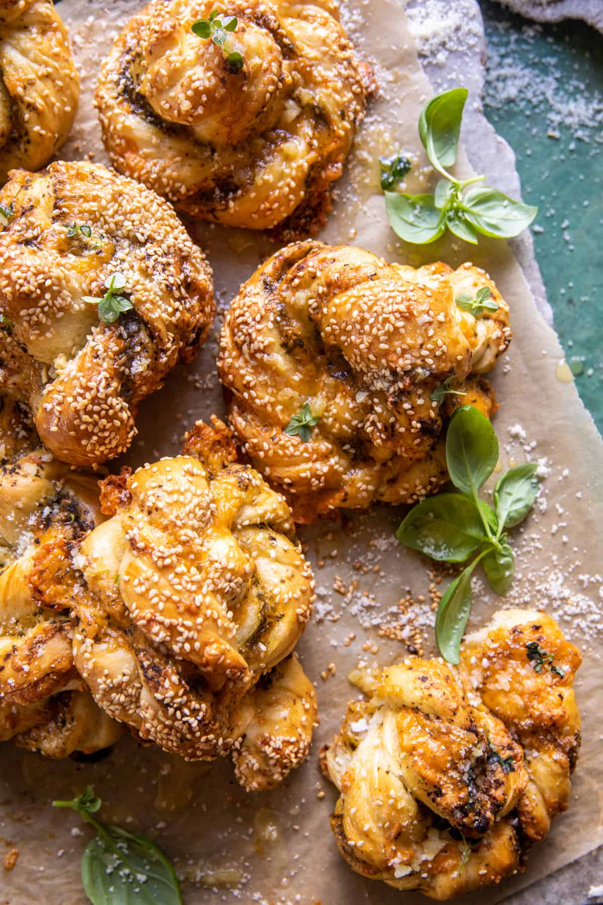 The pretzel dough is very easy to work with, so don’t let anything intimidate you! The key to these knots? The pesto cheese mixture for the filling, salted sesame crust, and that buttery, garlic parmesan topping.