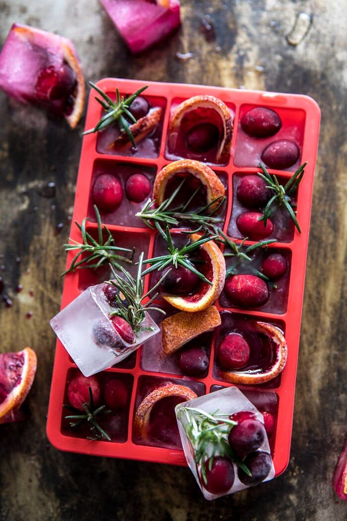 *To make festive ice cubes, place fresh cranberries, blood orange slices, and rosemary sprigs in an ice cub tray. Fill with water and freeze until solid.