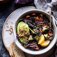 This soup is filled with all the things that make me feel good. For my veggies, I went with carrots, broccoli, kale, and purple cabbage. Then I seasoned it up with loads of fresh ginger, garlic, cayenne, soy sauce and a splash of apple cider vinegar. Next I added lentils for heartiness and then finished the soup off with some fresh parsley, lemon juice and vegan parmesan (you can use regular parmesan too…that’s obviously just as amazing). It’s basically perfection in a bowl and so super healthy. If you want to add protein to this recipe, shredded roasted chicken or italian sausage would be a great addition.