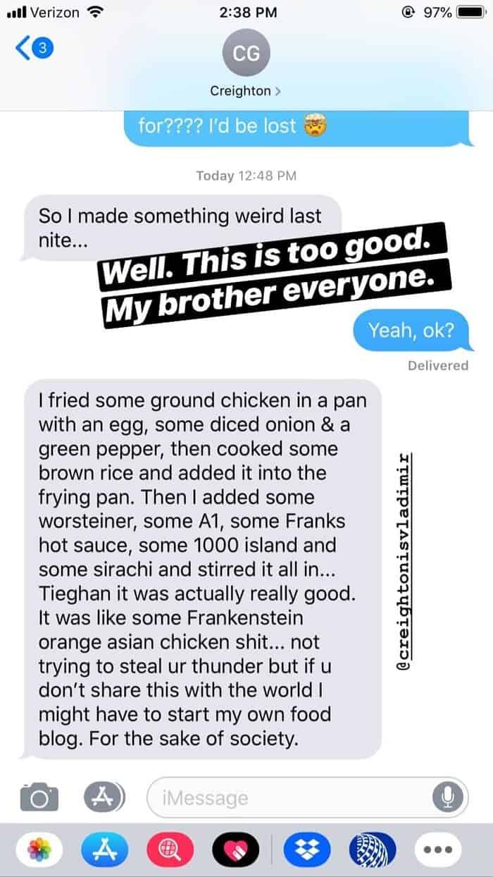 Omg..I laughed right out loud when I read your text message from your brother..so funny! I will say he was very …um…creative..haha! Didn’t sound “so” bad at the beginning of his recipe….lol..Anyways..looking forward to “your” creativities this week Tieghan. Lost my cooking mojo this past week! ?