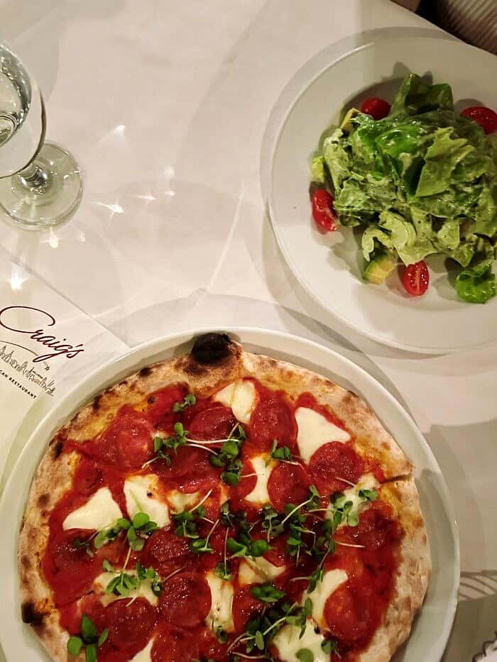 We didnโt finish shooting until 8 pm and had an hour+ drive back into the city. But Kristen and I made the decision the second we got in the car that we were finally going to go to Craigโs, an LA โhotspotโ. I will say, it was definitely a โhotspotโ. We only ordered a pizza to share and their Goddess Salad, but Iโm told that their chicken parmesan or bolognese is really the thing to get.