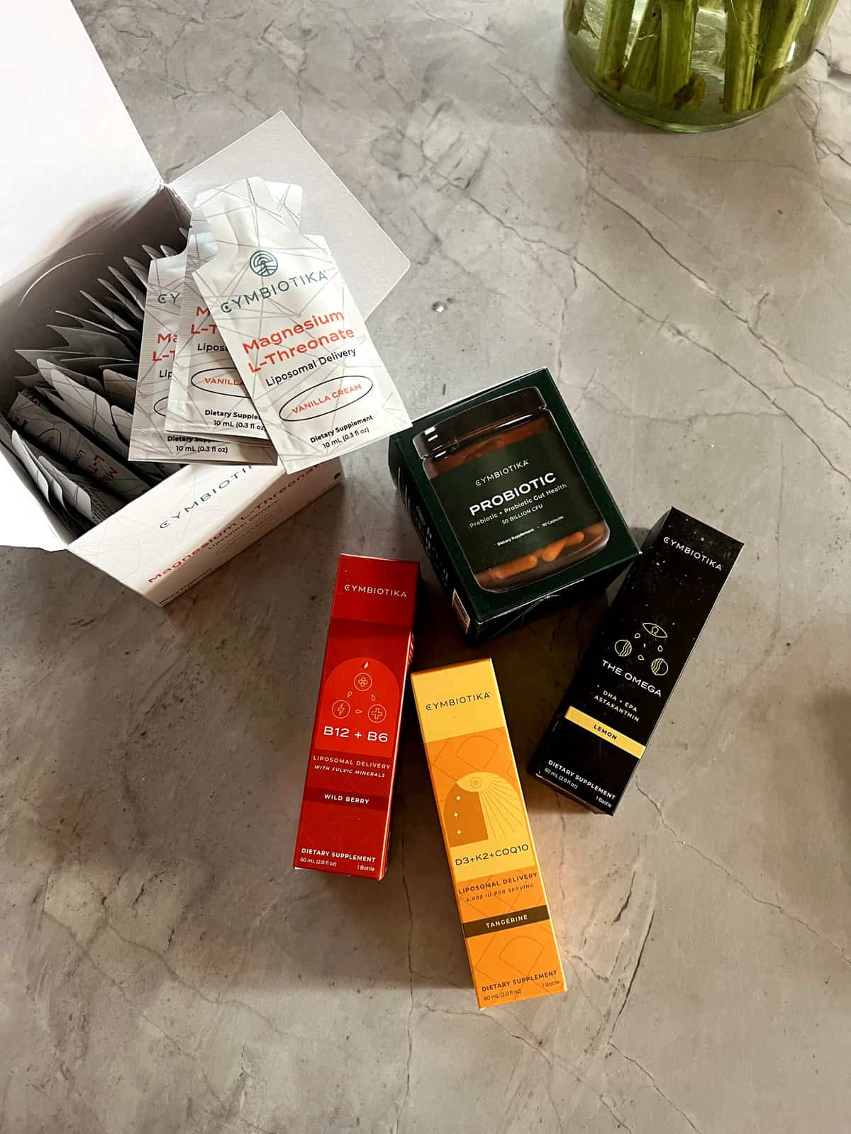 This is my core Cymbiotika line up. I take these while home and traveling – Vitamin B12 + BC (boosts energy, supports heart health, and generally is a vitamin most women are lacking) and Vitamin D3 + K2 + CoQ10 (supports immune health and strong bones by assisting in the regulation of calcium and cardiovascular health by reducing arterial plaque)  and the Magnesium L-Threonate, plus probiotic.