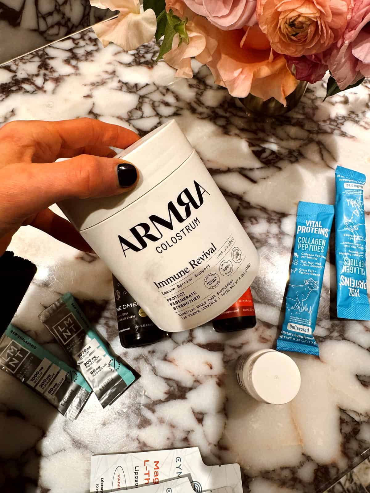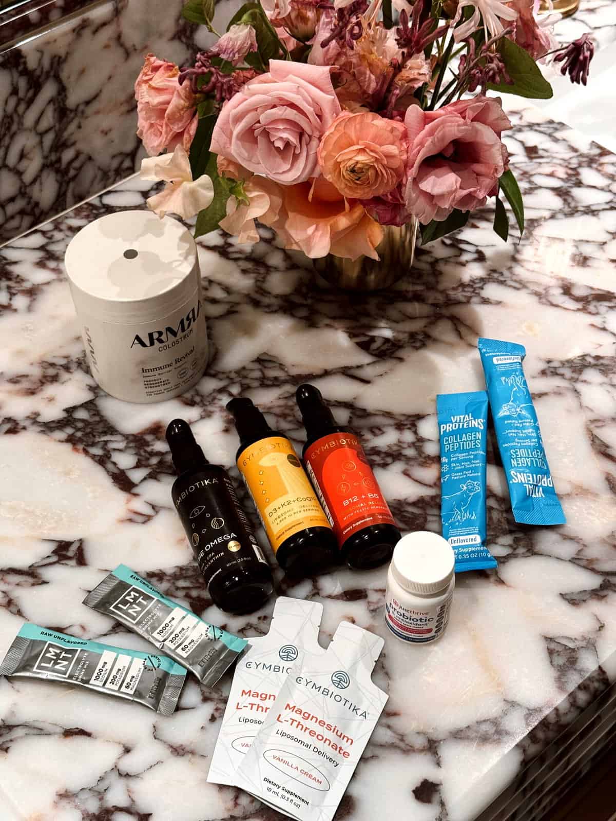 My travel go-to’s: Cymbiotika Magnesium L Threonate, Armra, Vital Proteins (I recently started learning more about different metals in protein and collagen powders – I’m currently researching different brands to find out what’s best). Epic venison beef strips, and Cymbiotika B12, D3, and The Omega. And lastly, I think colostrum is the secret to health.