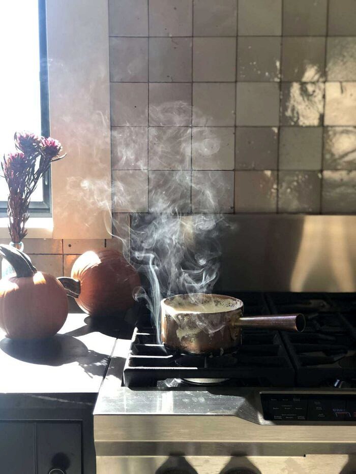 I LOVE the light in the studio kitchen, my sugar pie pumpkins, my Clè tiles, and my KitchenAid range.