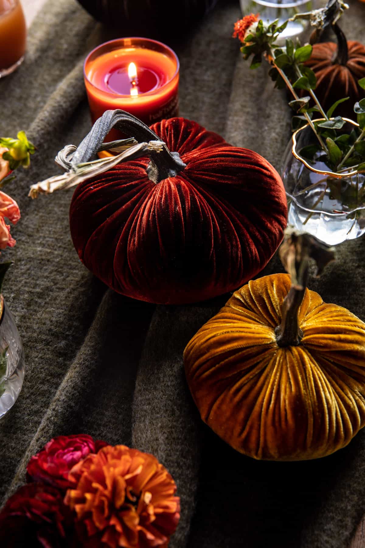 It was my tablescape that inspired my menu this year. I wanted to create the prettiest fall Pumpkin Patch to go with our Pumpkin Smash candle. I found these gorgeous velvet pumpkins and built out the recipe for my menu from there. It’s so much fun!