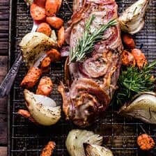 Anyway, I’m always in need of quick and easy meals, and I feel like most of you are probably in the same boat, especially right about now. Whether you have family in from out-of-town, or it’s just you and your immediate family, everyone needs an easy dish to prepare. Enter this pancetta wrapped pork tenderloin. I used Smithfield’s Garlic Marinated Pork Loin and then simply wrapped it in pancetta for extra flavor. The pancetta adds a lot, and it keeps the pork from drying out as it roasts in the oven. Plus, who doesn’t love crispy pancetta. It’s basically Italian bacon, and it’s so delicious.