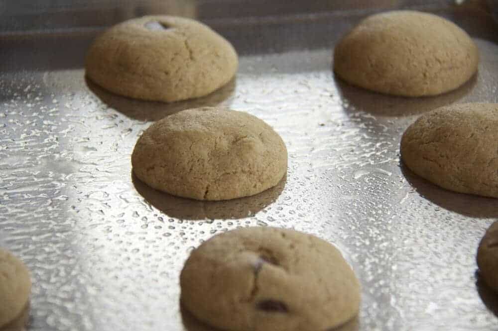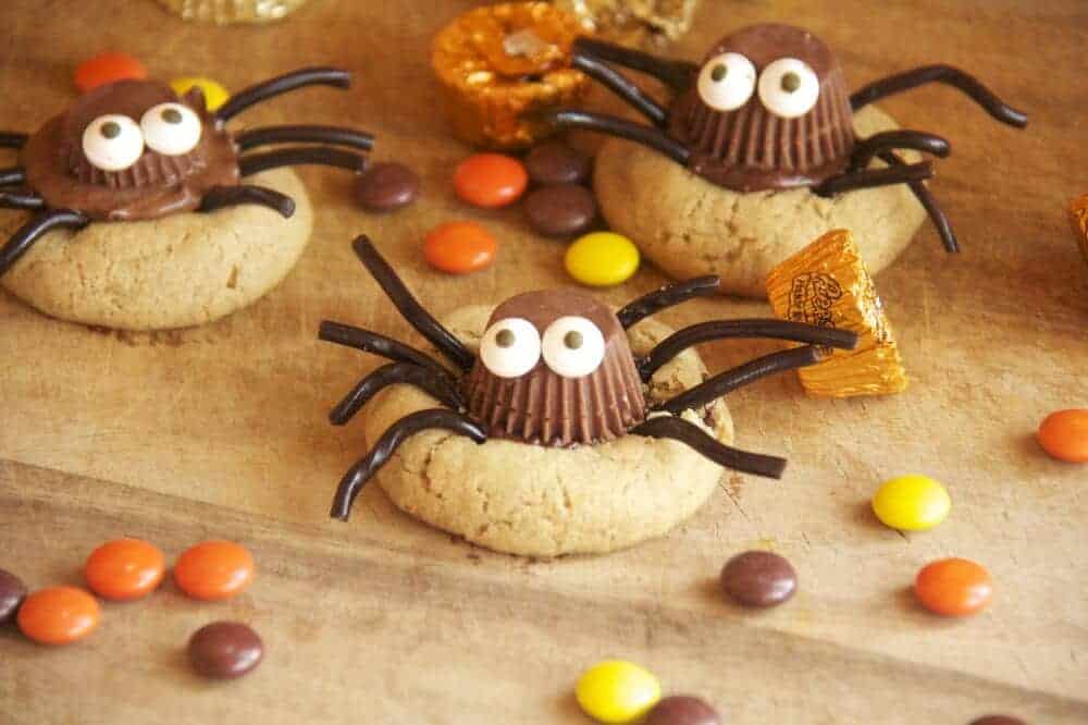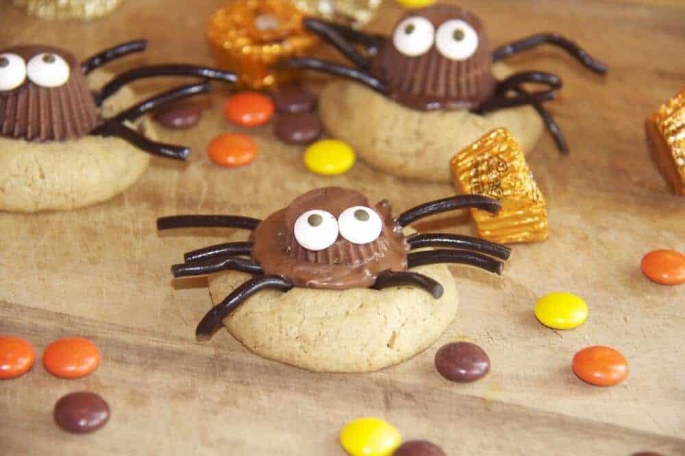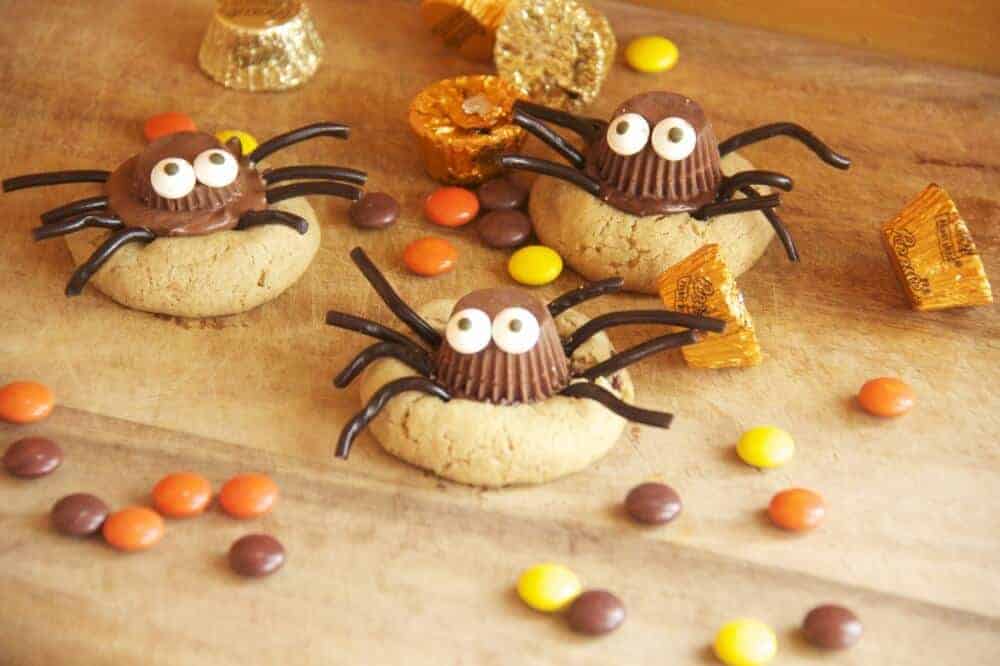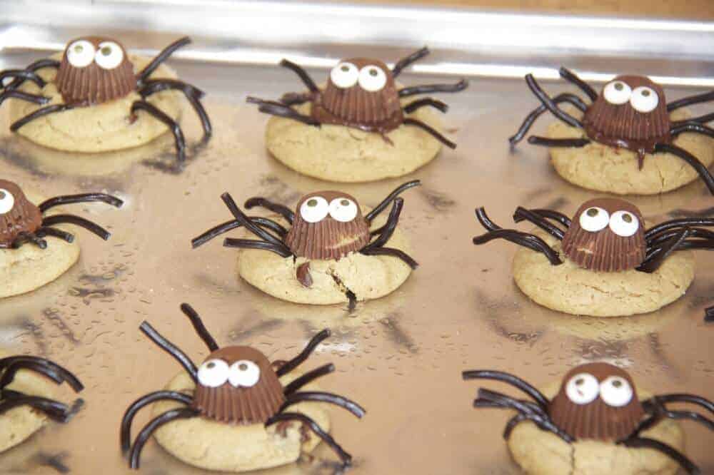 You have to work fast once the cookies come out of the oven and gently push each mini Reese into the middle of the cookie so it sinks and begins to melt a little into the cookie itself. Then let them cool off a little and just attach the legs and eyes using some melted chocolate.