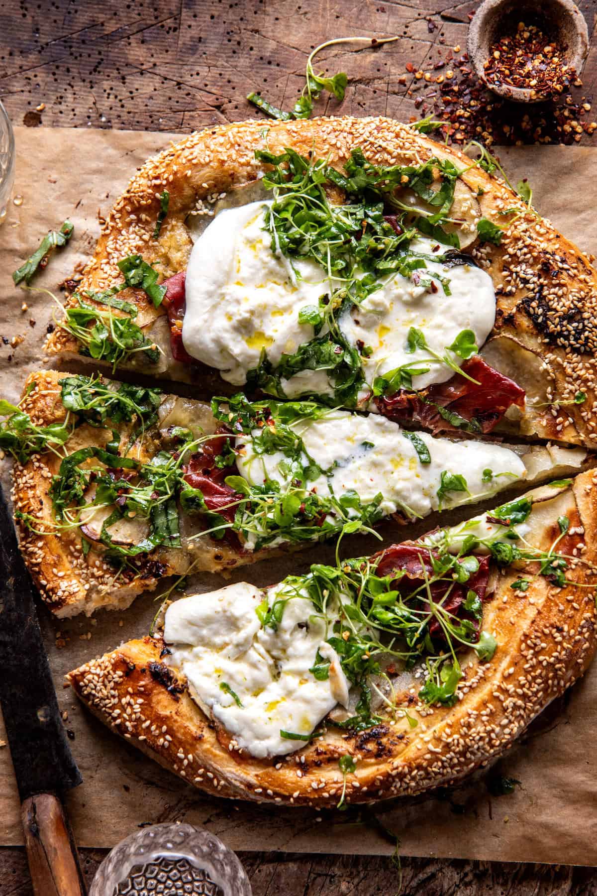 Potato Prosciutto Burrata Pizza. Fresh pizza dough with a toasted sesame seed crust, then topped with basil pesto, shallots, lots of freshly grated provolone cheese, thinly sliced potatoes, and seasoned with flaked sea salt and black pepper. Add a layer of thinly sliced prosciutto and freshly torn basil leaves just before cooking. The prosciutto gets all crispy in the oven; it’s so delicious! And the sesame-topped crust adds a special touch. There never seem to be enough slices to go around! I recommend baking up two pies!