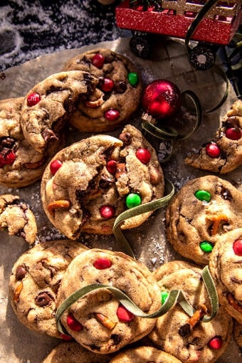Made with browned butter, holiday M&M's, pretzels, chocolate chips, and chunks of dark chocolate…so yummy!