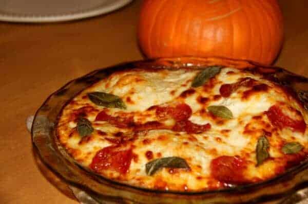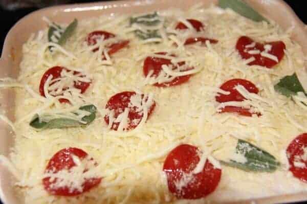The sage leaves get all crispy and delicious in the oven and the dish comes out looking beautiful. This would be great to serve for a dinner party, it can feed a crowd and can easily be made vegetarian by eliminating the pepperoni.