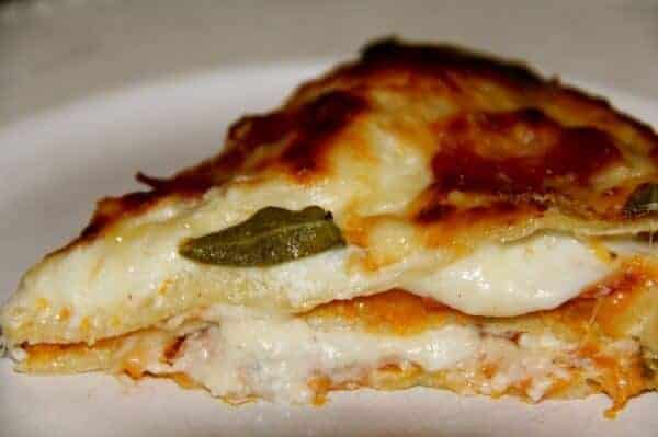 Assembly: Preheat the oven to 375 degrees. Brush a 9-by-13-inch glass baking dish with melted butter or oil, and layer in the following order from the bottom: béchamel (saving about 1 cup béchamel for last topping), pasta, squash filling, pepperonis and sprinkle with a third of the reaming cheese. Repeat, making 3-4 layers of pasta. I like the very top layer to be just the béchamel, cheese, and pepperonis. Then if desired top with 6-8 whole Sage leaves, they with get brown and crispy in the oven. Cover with foil and bake in the oven for 45 minutes, until the top is golden brown and the casserole is bubbling. Remove from the oven, allow to cool for 20 minutes, slice, and serve.