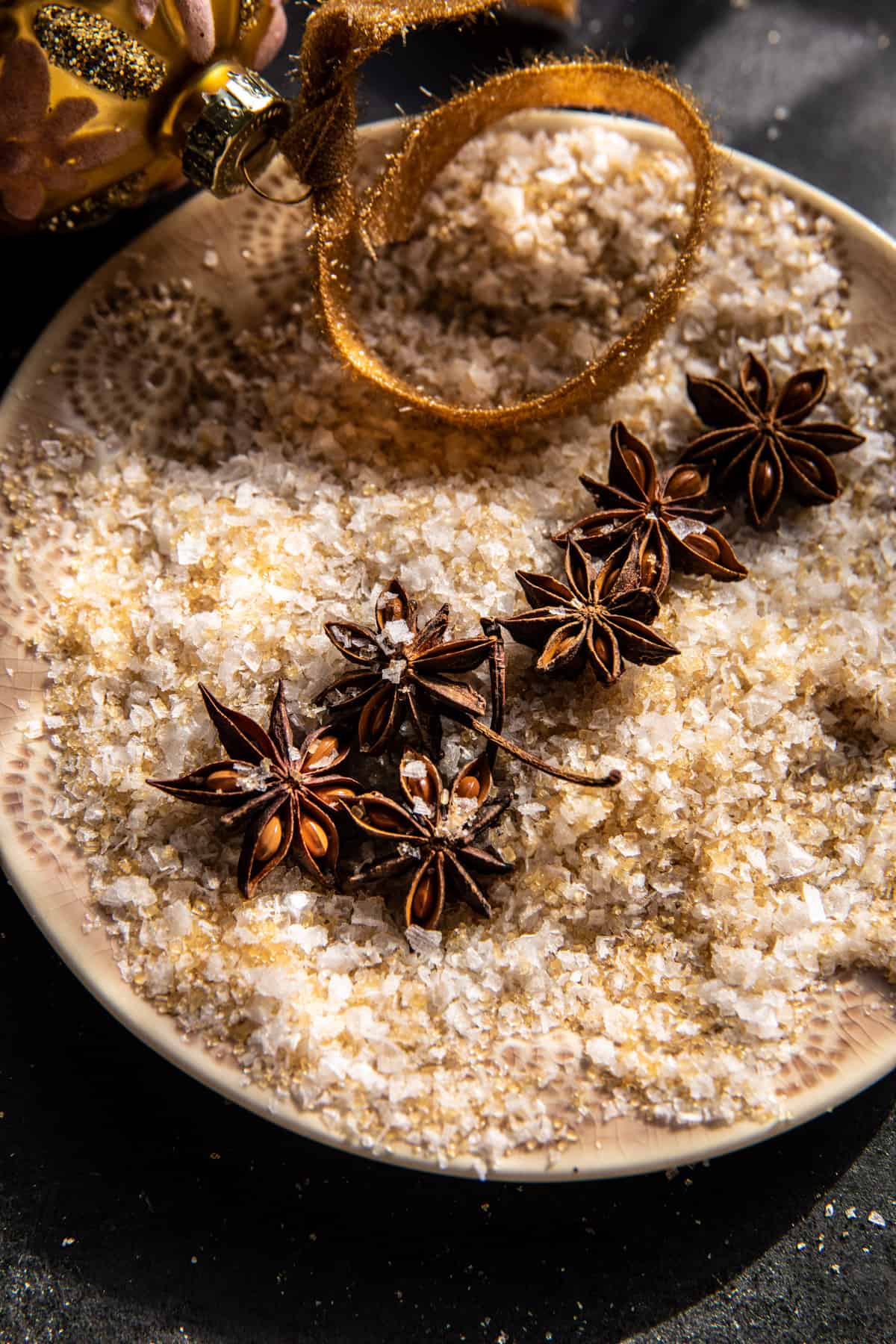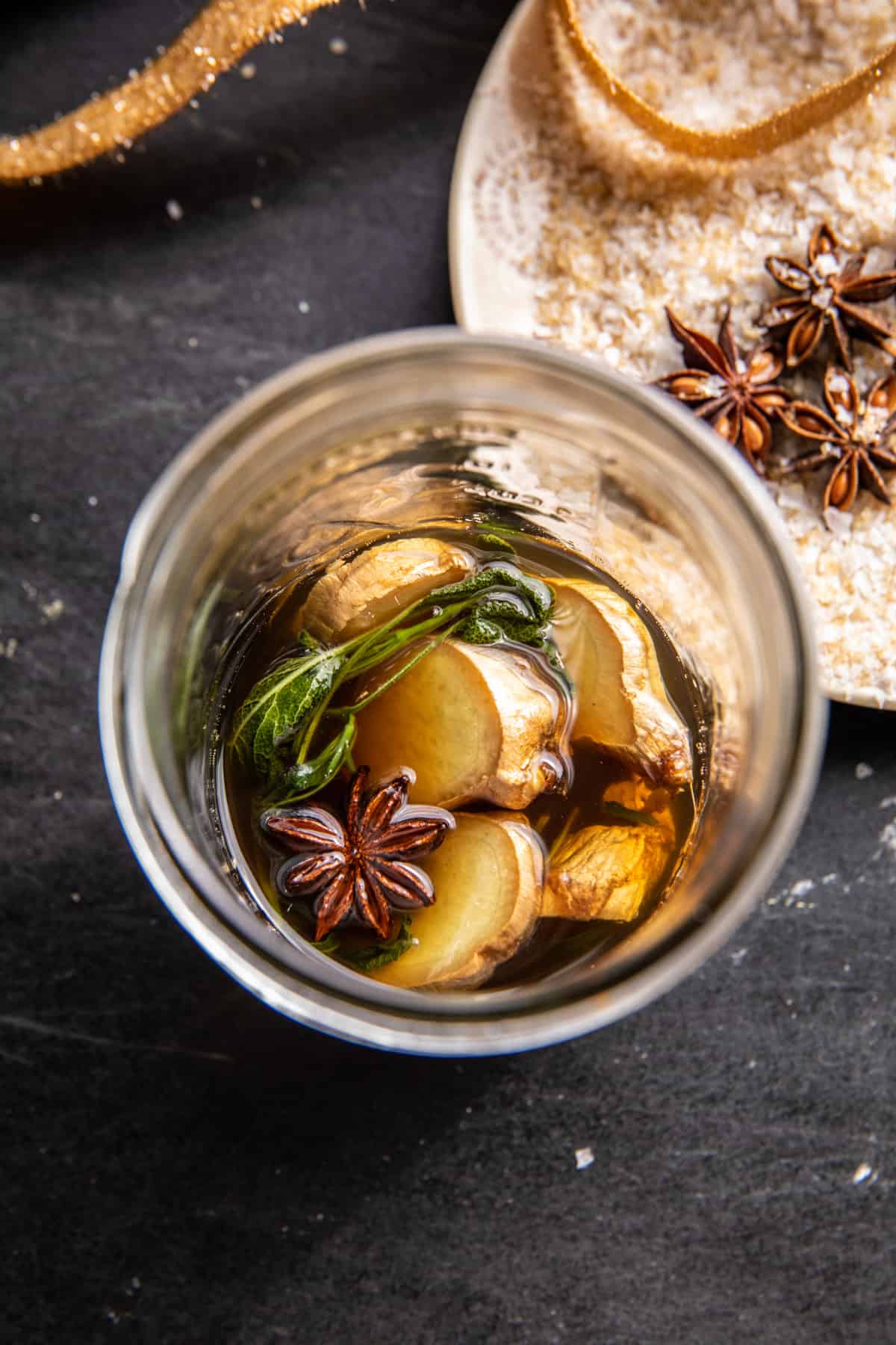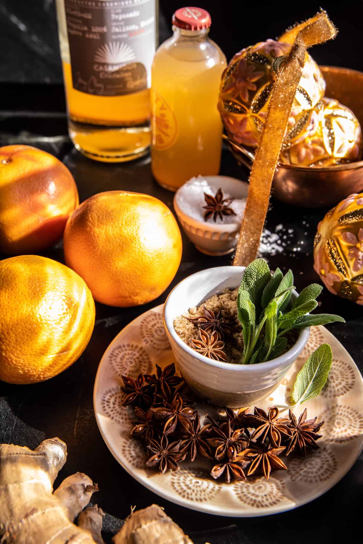 It’s a mix of brown sugar or honey, I usually use honey, but brown sugar does add a bit of holiday specialness. Then fresh ginger, sage, and star anise. The star anise adds a hint of peppery spice, but it’s not intense, it’s just right.
