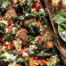 This dish was inspired by one of my favorite salads—I took a few of the elements I love most, like the seasonings, sweet potatoes, and that dreamy dressing, and turned them into a full sheet pan meal!