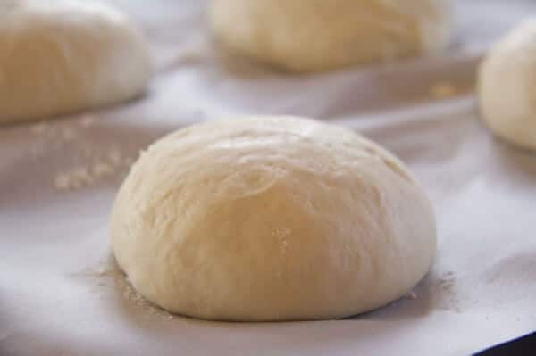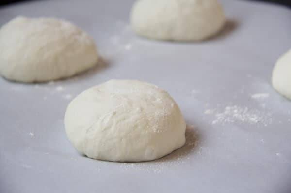 - Line a baking sheet with a silicone baking mat or parchment paper. Transfer the dough ball to a lightly floured work surface and gently deflate the dough. Divide the dough into eight equal portions. Form each piece of dough into a ball, and tuck any loose edges or seams underneath. Place seam-side down on the prepared baking sheet. Repeat shaping with the other 7 pieces of the dough. Transfer the shaped boules to the prepared baking sheet. Cover loosely with lightly oiled plastic wrap. Let rise in a warm place until nearly doubled in volume, about 2-3 hours.
