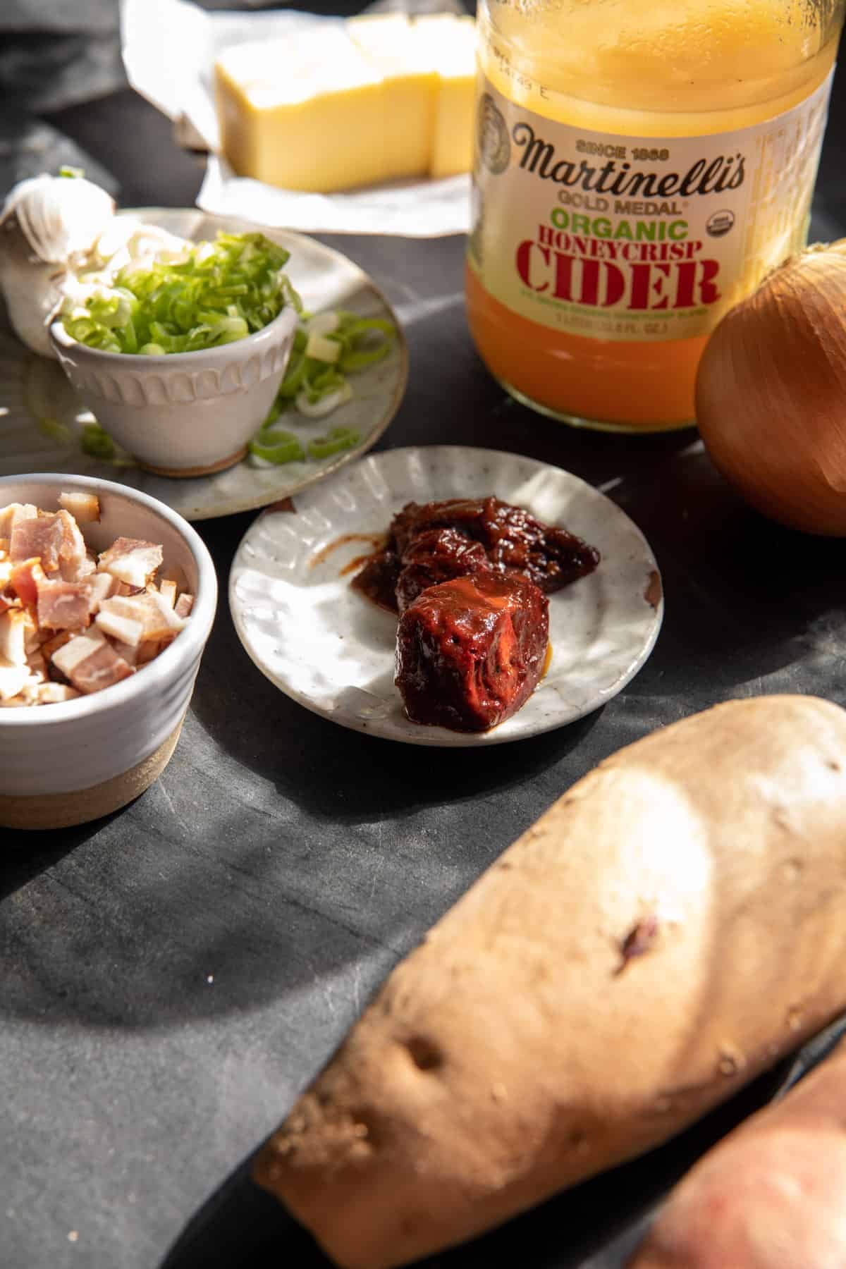 I haven’t made a sweet potato soup in a while so I was really excited about this idea! A creamy sweet potato soup with chipotle and sharp cheddar cheese, kind of similar to a more classic baked potato soup, but different with the use of sweet potatoes. They add such a uniqueness and I love the twist.