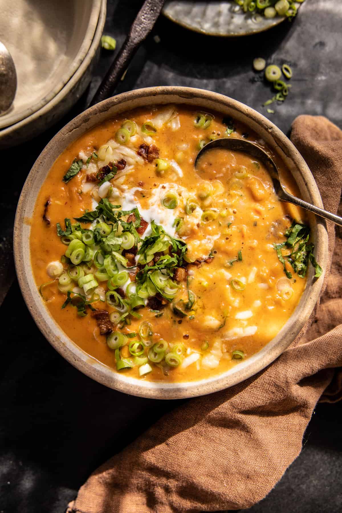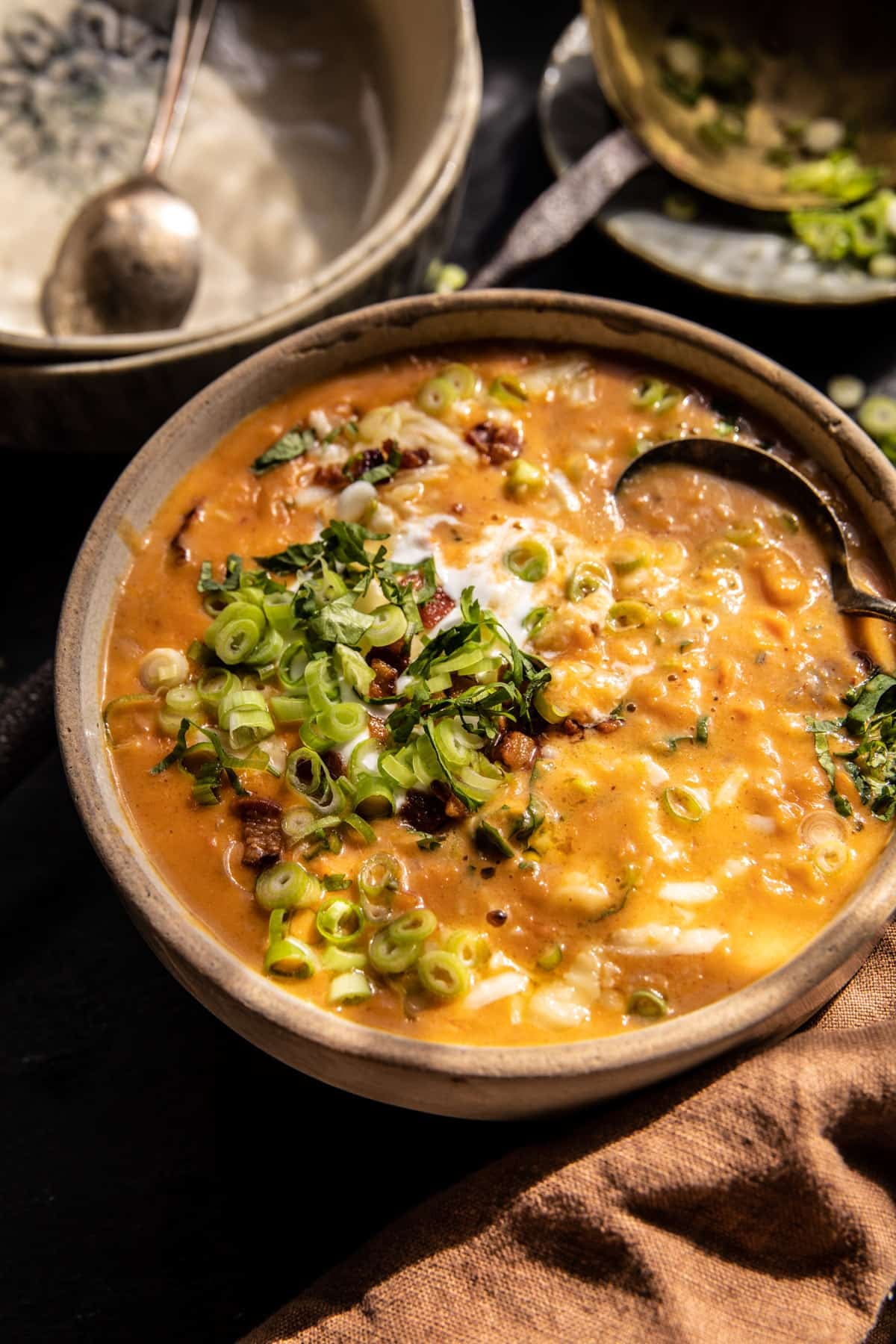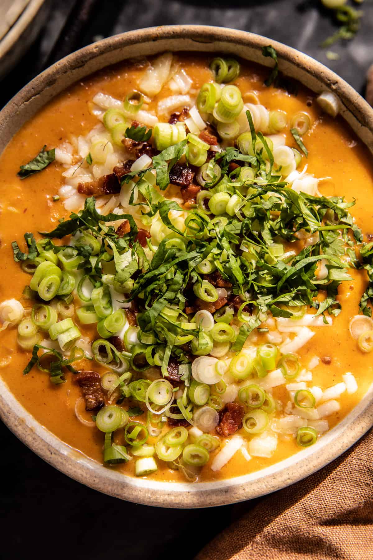 This one pot Baked Chipotle Cheddar Sweet Potato Chowder is the coziest bowl to warm up to on cold fall and winter nights. Made with crispy bacon, sweet potatoes, canned chipotle in adobo, and sharp cheddar cheese. This chowder is mildly spicy, creamy, full of wonderful color, and so delicious. Top each bowl of creamy soup with plenty of cheddar cheese, fresh cilantro, lots of green onions, and crispy homemade bacon bits! Great on its own, but even better with a side of homemade beer bread. Yum!