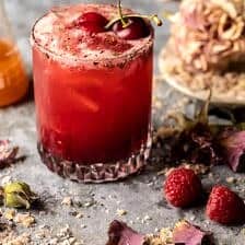 Today I’m bringing back Harry Potter inspired cocktails with this raspberry rosemary shrub. Fresh raspberries and sweet raspberry jam, smashed together with rosemary, lemon, apple cider vinegar, vodka, and fizzy sparkling water. This makes for a simple and quick Harry Potter themed cocktail. A sweet lemon rose sugar lined rim is the perfect sweet touch that leaves everyone wanting more.