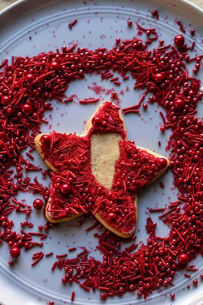 Just find some fun sprinkles, red sanding sugar, mini chocolate, and use up that homemade vanilla sugar. I did my best to explain my process within the directions, but guys, have fun with these cookies! The more imperfect they are the cuter they end up being. Perfect for kids!