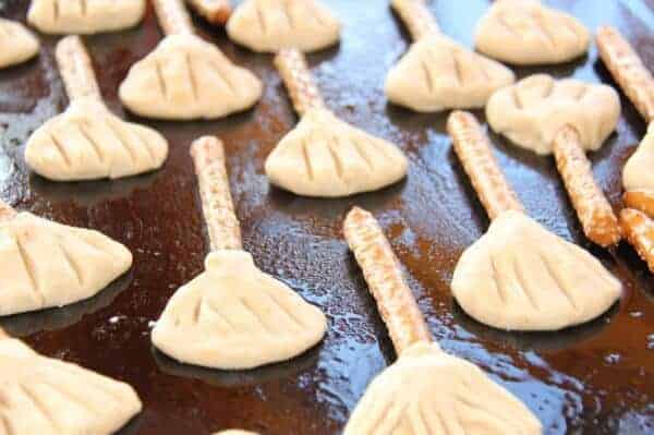 Take one of the cookie balls and press it onto the pretzel handle. It’s not necessary to wrap it all the way around the pretzel, just flatten the ball onto it. Once you’re happy with your broom shape, use a fork to press the bristle shapes into the cookie. You might need to reshape the cookie a little again after using the fork.