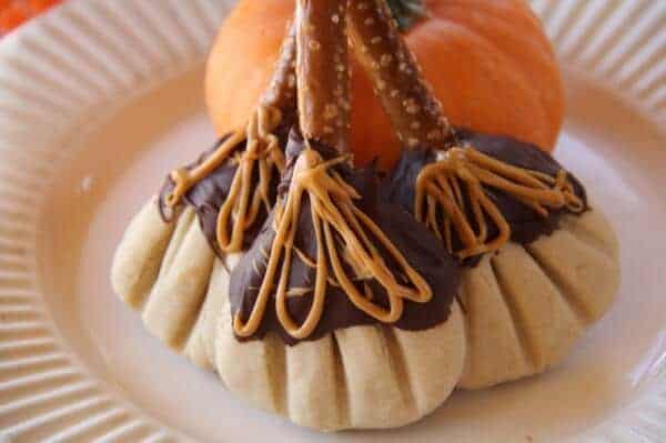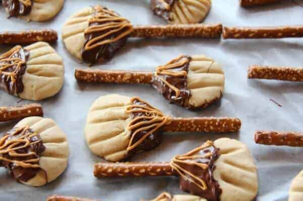 Remove from heat. Spoon melted chocolate over brooms, leaving about 1 inch at top of pretzel handle and bottom halves of cookie bristles uncovered.